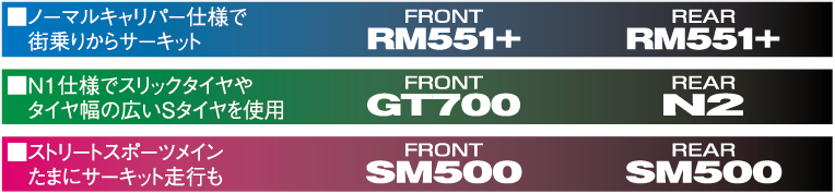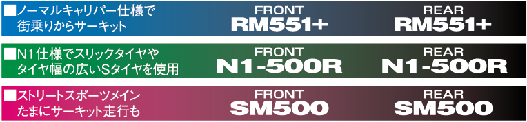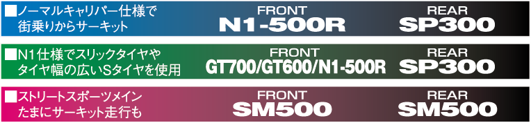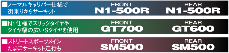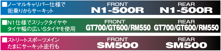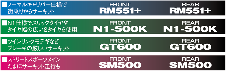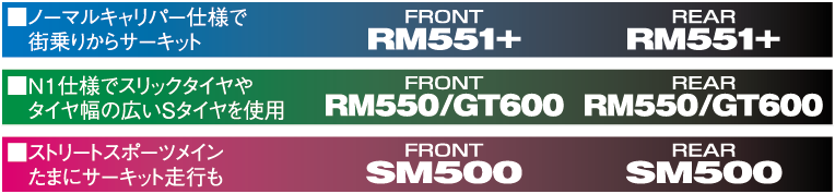 重量級であり絶対的に機器の高いもので、初期の立ち上がりスピードの早いもの。前後同材質又はリヤの効きが高いもの。